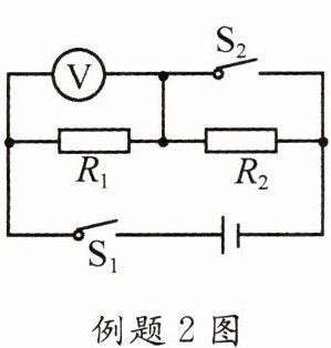 【例题 2】在如图所示的电路中,电源电压保持不变,开关 $ S_1 $、$ S_2 $ 都闭合时电压表的示数为 $ 6 \, V $,通过 $ R_1 $ 的电流为 $ 0.6 \, A $;只闭合开关 $ S_1 $ 时,电压表的示数为 $ 2 \, V $。