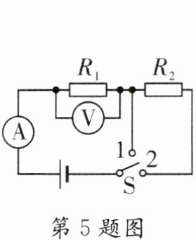 5. 如图所示,电源电压 $ 6 \, V $ 不变,电阻 $ R_1 = 10 \, \Omega $,$ R_2 = 20 \, \Omega $,当开关 $ S $ 接 $ 2 $ 时,电压表示数为