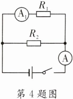 4. 如图所示,电源电压恒定不变,定值电阻 $ R_1 $ 的阻值为 $ 10 \, \Omega $。闭合开关,电流表 $ A $ 的示数为 $ 0.5 \, A $,$ A_1 $ 的示数为 $ 0.3 \, A $,则电源电压为
