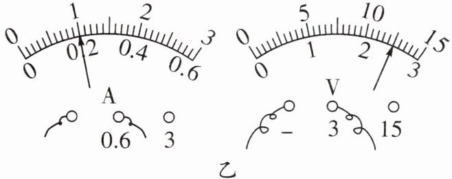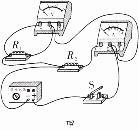 5. 如图甲所示电路,电源电压不变,$ R_1 $、$ R_2 $ 是定值电阻,$ R_2 = 2R_1 $,闭合开关 S,电流表和电压表示数如图乙,则通电 5 min 后,$ R_1 $、$ R_2 $ 产生的总热量为