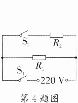 效应工作的。某品牌电饭煲有“加热”和“保温”两挡功能,简化电路如图,$ R_1 = 242 \Omega $,$ R_2 = 60.5 \Omega $。当该电饭煲处于“加热”挡工作 10 min,其消耗的电能是$6 × 10^{5}$