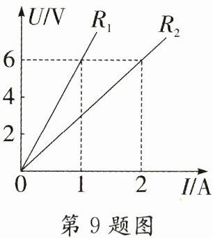 9. 有R₁、R₂两个电阻,它们的U-I图像如图所示。将R₁、R₂串联接入电路中,当通过R₁的电流为0.8A时,R₁、R₂两端的电压之比为(