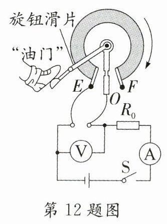 12. 为减少碳排放,我国大力推行电动汽车。电动汽车中,利用接入电路的旋钮变阻器,可控制汽车中电动机的转速,图中OEF为变阻器的三个接线柱。当驾驶员踩下“油门”时车速仪示数增大,车速仪可由电路中的电压表或电流表改装而成。下列说法正确的是(