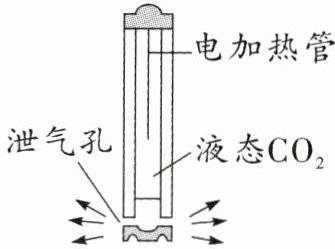 11. (2024·山西)二氧化碳($CO_2$)爆破技术是现代工程建设中非常环保的技术,起爆前高压泵将$CO_2$压缩成高压气体,液化后输入爆破筒内。如图所示,爆破时电加热管发热,使筒内的液态$CO_2$迅速汽化,形成的高压气体从泄气孔中喷出,实施爆破。下列说法正确的是( )