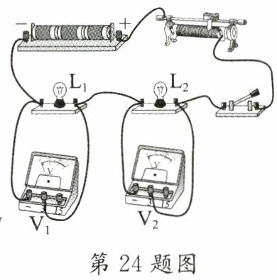 24. 实验室有两只额定电压相同的小灯泡L₁、L₂,小华想知道哪只灯泡额定功率大,于是将它们串联接入电路,如图所示。闭合开关,两只灯泡均发光,电压表V₁示数比V₂小,此时实际功率大的小灯泡是