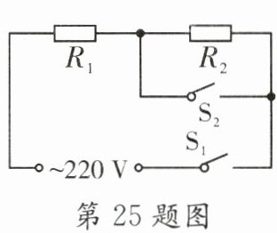 25. 如图是某电加热器的工作电路图,电加热器有“高温”和“低温”两挡,其中R₁=44Ω,R₂=176Ω。当开关S₁闭合,S₂
