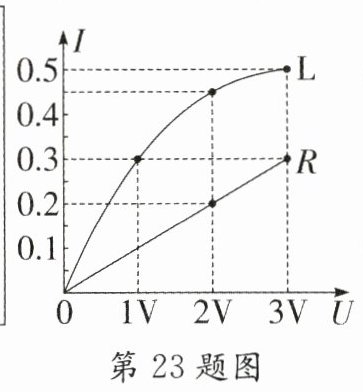 23. (2024·达州)定值电阻R和灯泡L,其电流随两端电压的变化图像如图所示。若将R与L串联在4V电源两端,则R与L消耗的电功率之比为