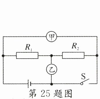 25. 如图所示,若甲、乙两表为电压表,当开关S闭合时,两表示数之比为$U_甲:U_乙$=3:2。若甲、乙两表为电流表,当开关S断开时,两表示数之比为$I_甲:I_乙$=