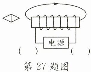 27. (2分)如图,小磁针静止在通电螺线管左侧,请标出小磁针的N极和电源正极。