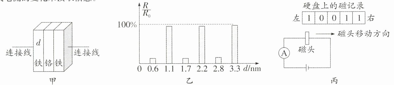 (5)丙图是硬盘某区域磁记录的分布情况,其中1表示有磁区域,0表示无磁区域。将“新型读出磁头”组成如图所示电路,当磁头从左向右匀速经过该区域过程中,电流表读数变化情况应是丁图中的。