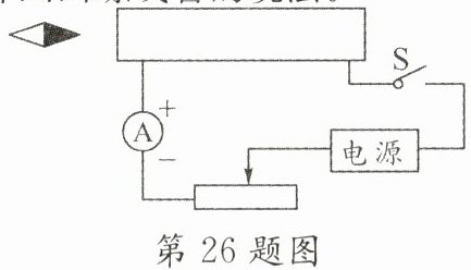 26. (2分)如图所示,电路连接正确,通电后小磁针指向如图所示(涂黑端表示N极)。请在图中标出螺线管的磁极、电源的“+”“-”极,并画出螺线管的绕法。