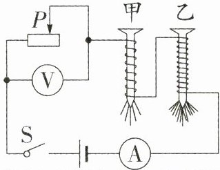 (3)根据图示的情景可知,电磁铁______(选填“甲”或“乙”)的磁性较强,说明电流一定时,线圈匝数______,电磁铁磁性越强;实验发现被电磁铁吸引的大头针下端是分散的,其原因是大头针被磁化后。