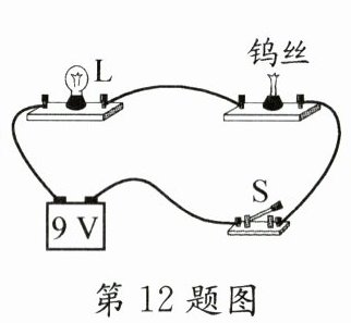 12. 如图所示的钨丝是将一个白炽灯去除玻璃罩制成的,闭合开关S,灯泡L发光,钨丝不发光;向钨丝吹气时,灯泡L变亮,用酒精灯给钨丝加热,灯泡L逐渐变暗直至熄灭。由实验可知 (