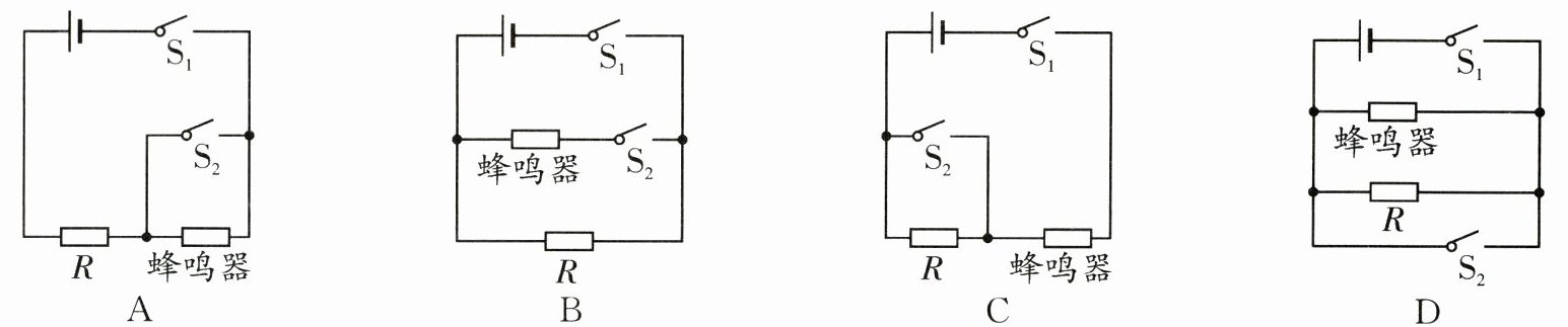 7. 为避免立定跳远测试起跳时过线犯规,学校引进了一批体育练习装置。装置的基本原理是,当有同学踏上练习垫时,开关S₁、S₂同时闭合,当装置感应到脚尖过线,红外感应开关S₂断开,蜂鸣器发出声音提醒同学犯规。下列选项能实现上述功能的电路图是 (