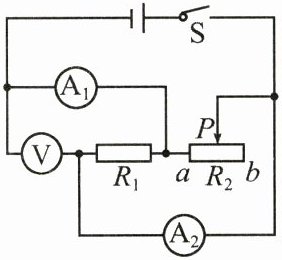 C.当滑片P向b端滑动时,电压表示数不变,电流表A₂示数不变