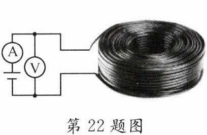 22. 小明发现实验室里有一卷单股导线,他了解到此类电线每米的电阻约为0.3Ω。为了粗略估算电线有多长,小明用电压表、电流表和电源连接成如图所示的电路进行测量。测得电压表的示数为5.4V,电流表的示数为0.3A,则导线的电阻为