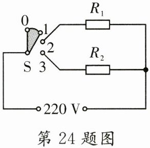 24. 某电熨斗有“低温”“高温”两个挡位,其简化电路如图所示,R₁、R₂是电热丝,R₁=48.4Ω,R₂=96.8Ω,S为旋转式开关。当旋转触片接触到触点1和2时,电熨斗为