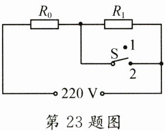 23. 有一种电热水壶常有“烧水”和“保温”两个挡,如图所示是其内部简化电路图。已知R₀=55Ω,R₁=1045Ω,当S接1时,电热水壶处于