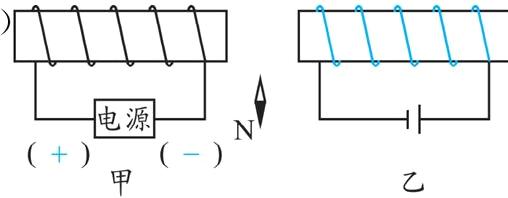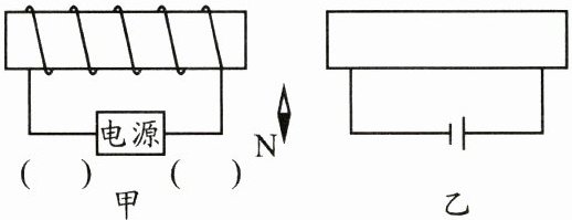 25. (2分) 如图所示,小磁针静止在两个通电螺线管之间,N极竖直向下。请你在甲图括号内标出电源的“+”“-”极,并画出乙图通电螺线管的绕线。