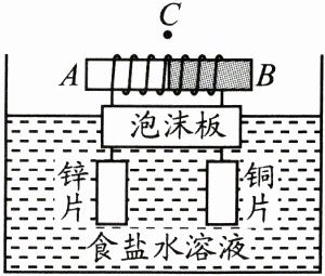 3. 如图所示是项目学习小组的同学设计的漂浮式指南针,铜片、锌片和食盐水溶液共同组成了“盐水电池”,铜片是“盐水电池”的正极,锌片是负极。下列说法正确的是 (