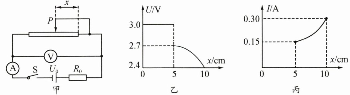 5. 物理兴趣小组的同学,为了探究滑动变阻器的电流、电压关系,按照如图甲所示的电路进行实验。组装好电路后,闭合开关,让滑片P从最右端开始向左滑动,测量滑片到最右端的距离x,同时观察电压表、电流表的示数,记录数据并绘制图像。电压表读数U与x的关系如图乙所示,电流表读数I与x的关系如图丙所示。根据题目信息,以下说法中正确的是 (