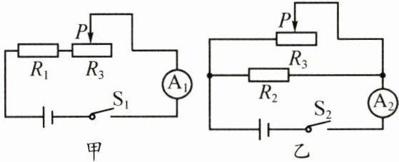 4. 在如图所示的两电路中,R₁、R₂为定值电阻,滑动变阻器R₃(最大阻值为R₃)相同,电源电压相等且保持不变,闭合甲图中开关S₁,将滑动变阻器的滑片P从最左端移到最右端,发现电流表A₁的示数变为原来的1/3。再将甲图中的滑片移到最左端、乙图中的滑片移到最右端后,闭合开关S₁、S₂,发现电流表A₁、A₂的示数为之比为1:2;此时R₁、R₂消耗的电功率分别为P₁、P₂。以下结论正确的是 (