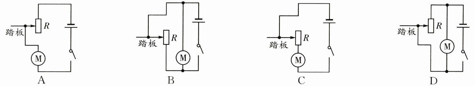 9. 下列新能源汽车的模拟电路中,电源电压保持不变。当驾驶员竖直向下踩"油门"踏板时,流经电动机的电流增大,车速会变大。符合要求的电路是(