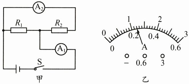 8. 在如图甲所示的电路中,当闭合开关后,两个电流表指针偏转均如图乙所示,则电阻R₁和R₂中的电流分别为(
