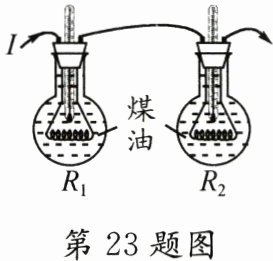 23. 如图所示是研究"相同时间内导体产生的热量与电阻的关系"的装置。每只烧瓶中煤油质量均为250 g,电阻丝R₁=20 Ω,电路中电流I=0.5 A。通电5 min后,左侧烧瓶中的煤油温度升高了2 ℃,煤油吸收的热量为