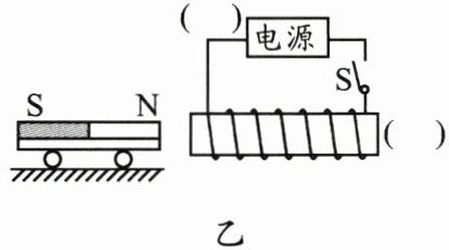 (2)如图乙所示,放有条形磁体的小车静止在水平地面上,闭合开关S,条形磁体因受磁力向左运动,请在图中括号里标明电源左端的极性和电磁铁右端的磁极。
