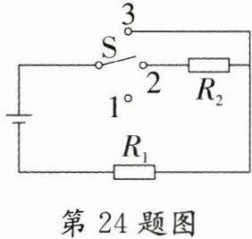 24. 小军通过观察和研究他家汽车上的电加热座椅垫(原理如图所示),发现该座椅垫有"高温""低温"和"关"三个挡位,S为挡位切换开关,R₁和R₂均为电热丝,电源电压恒为12 V,R₁=5 Ω,开关S切换到2时,电路处于
