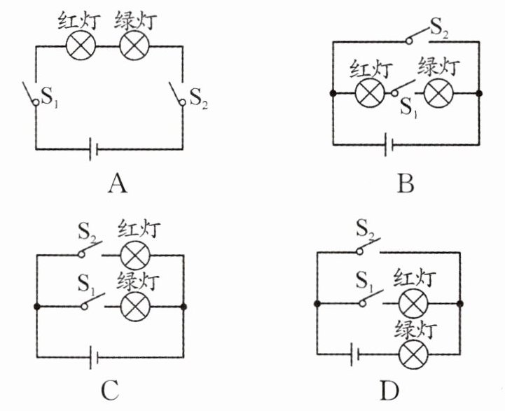 15. 交通路口安装着过斑马线的红、绿信号灯,下列符合红、绿信号灯工作情况的电路图是(