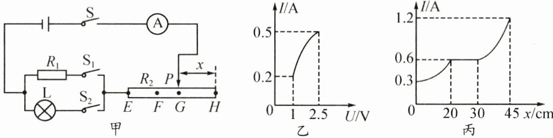 7. (6分)图甲是小明所设计的电路图,其中标有"2.5 V"字样的小灯泡L的电流与电压关系如图乙所示。定值电阻R₁=10 Ω,R₂由三段材料不同、横截面积相同的均匀直导体EF、FG、GH连接而成(总长度为45 cm),其中有一段是铜导体,其电阻可忽略不计,导体GH每1 cm的电阻为1 Ω,P是与R₂接触良好并能移动的滑动触头。只闭合开关S、S₁时,电流表示数I与滑片P向左移动距离x的关系如图丙所示。求: