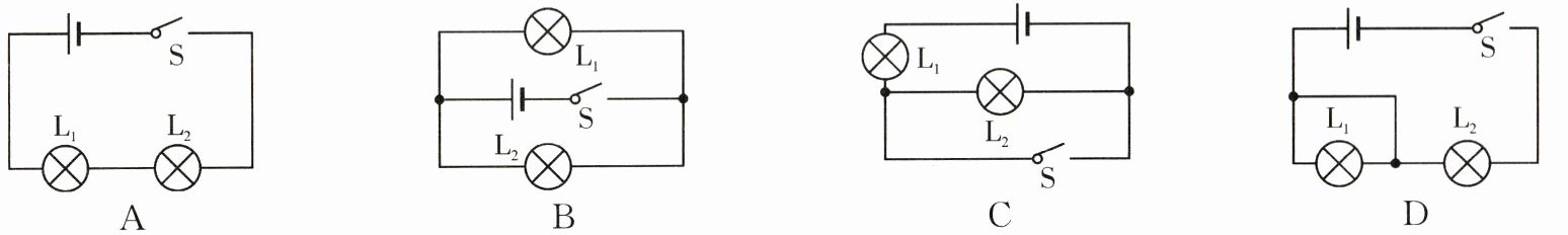 6. 如图所示的电路中,当开关S闭合时,灯泡L₁、L₂组成的电路为并联的是(