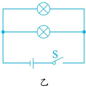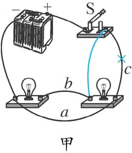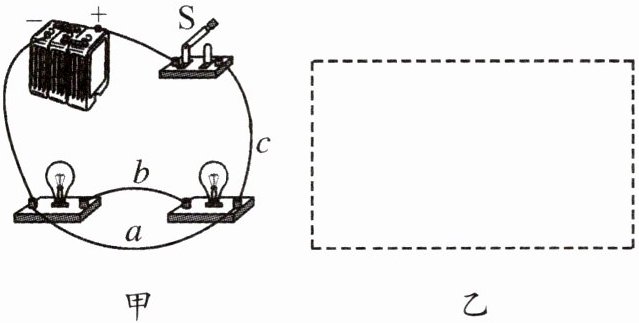 (3)改变 $ a $、$ b $、$ c $三根导线中一根的接法,使电路成为并联电路(先在原导线上打“×”,后更改接法),然后在图乙虚线框内画出所更改后的整个电路的电路图。