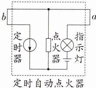 (选填“a”或“b”)处安装一个开关 S,断开此开关,指示灯熄灭,整个装置停止工作,点放烟花前,定时器在电路中应处于通路