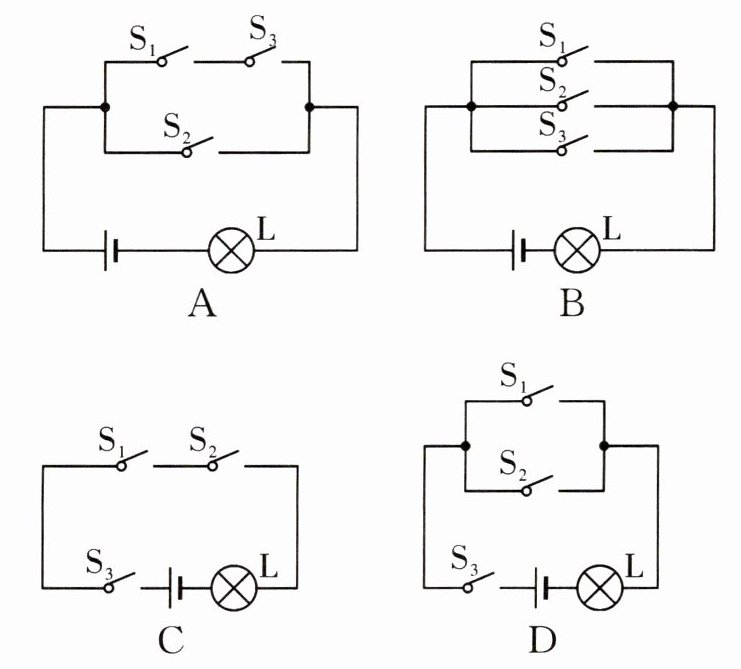 12. 如图所示,常用智能手机是通过指纹开关 S₁ 或密码开关 S₂ 来解锁的,若其中任一方式解锁失败,锁定开关 S₃ 均会断开而暂停手机解锁功能,S₃ 将在一段时间后自动闭合而恢复解锁功能,若用灯泡 L 发光模拟手机解锁成功,则符合要求的模拟电路是(