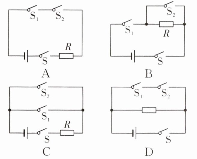18. 给某型号电烤箱设定好工作时间和温度,即闭合定时开关 S₁ 和温控开关 S₂,再闭合启动开关 S,电烤箱开始工作。当达到了设定的工作时间或温度时,定时开关 S₁ 或温控开关 S₂ 断开,电烤箱就停止工作。下列电路符合要求的是(