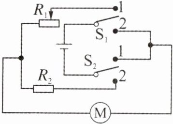 20. 电动轮椅为残疾人士出行提供了方便。某型号的电动轮椅的工作原理如图所示,操纵杆可以同时控制 S₁ 和 S₂ 两个开关。向前推操纵杆时轮椅前进且能调速,向后拉操纵杆时轮椅以恒定速度后退。当轮椅前进时(