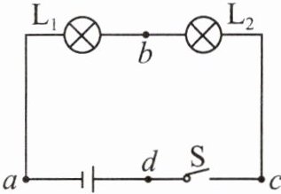 16. 如图所示,开关 S 闭合时,小灯泡 L₁、L₂ 都不亮,用一段导线的两端接触 a、b 两点时,两小灯泡都不亮;接触 b、c 两点时,两小灯泡也不亮;接触 c、d 两点时,两小灯泡都亮。对此,下列判断中可能的是(