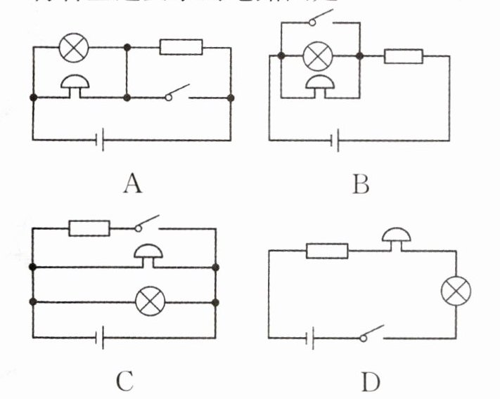 19. 某汽车设置了安全带指示灯和警示音,提醒前排人员系好安全带。前排人员就座后,系好安全带,相当于闭合开关,指示灯不亮,警示音不响;未系安全带,相当于断开开关,指示灯发光,警示音响起。下列符合上述要求的电路图是(