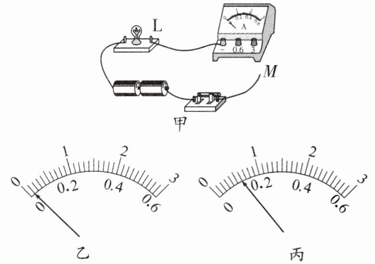 (2)小华解决问题后,先将线头 $M$ 接到电流表的“3”接线柱上,然后开关试触,发现电流表的示数如图乙所示,则出现上述现象的原因是所选的量程