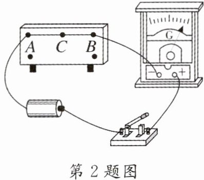 2. 某活动小组通过实验研究“决定电阻大小的因素”,其中的一个实验步骤是:将镍铬合金线 AB 段和 AC 段分别连入如图所示的电路。通过这个实验步骤可以研究,导体的
