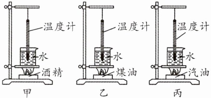 11. 某学校物理小组设计实验探究酒精、煤油、汽油的热值(如图)。甲、乙、丙装置完全相同,水的质量和初温及待测燃料的质量也相同。通过测量燃料完全燃烧后水的末温(均未达到沸点)$t_{甲} < t_{乙} = t_{丙}$,可以粗略知道它们的热值 $q$ 大小关系为(