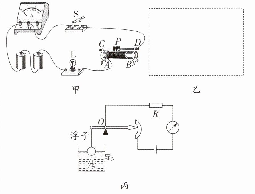 (选填“$ A $”或“$ B $”)端滑动。(4)某同学利用上述电路的工作原理设计并制作了一种自动测定油箱内油面高度的装置,如图丙所示,从油量表指针所指的刻度就可以知道油面的高度。油量表其实是表;当油面升高时,滑动变阻器的阻值(选填“变大”或“变小”),油量表示数(选填“变大”或“变小”)。在该电路中,定值电阻 $ R $ 的作用是。