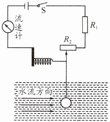 16. 如图是小红尝试设计流速计的原理图,其中 $ R_2 $ 是滑动变阻器,滑动变阻器的滑片跟小球以及弹簧固定,弹簧另一端固定不动。水流动时推动小球,带动滑动变阻器滑片移动,从而改变电路中流速计的示数。下列说法