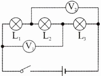 7. 如图所示的电路中,闭合开关,电压表 V₁ 的示数是 7.5 V,电压表 V₂ 的示数为 9 V,若电源电压为 12 V,则 L₂ 两端电压是(