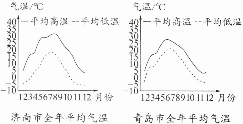 【例题 3】如图所示为济南和青岛两市 2022 年全年平均气温的变化。由图可知:济南全年的平均气温和青岛相差不大,但济南的平均高温要明显高于青岛,而平均低温要比青岛低。从物理学的角度看,这主要是因为(