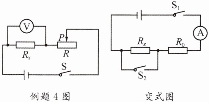 。(用已知和测出的物理量符号表示)【变式】小芳利用伏安法测量出未知电阻$ R_{x} $的阻值(阻值大约为5 Ω)后,她又设计了一种方案,也测出了$ R_{x} $的阻值。电路如图所示,$ R_{0} $为阻值已知的定值电阻,电源电压未知且恒定不变。测量步骤如下: