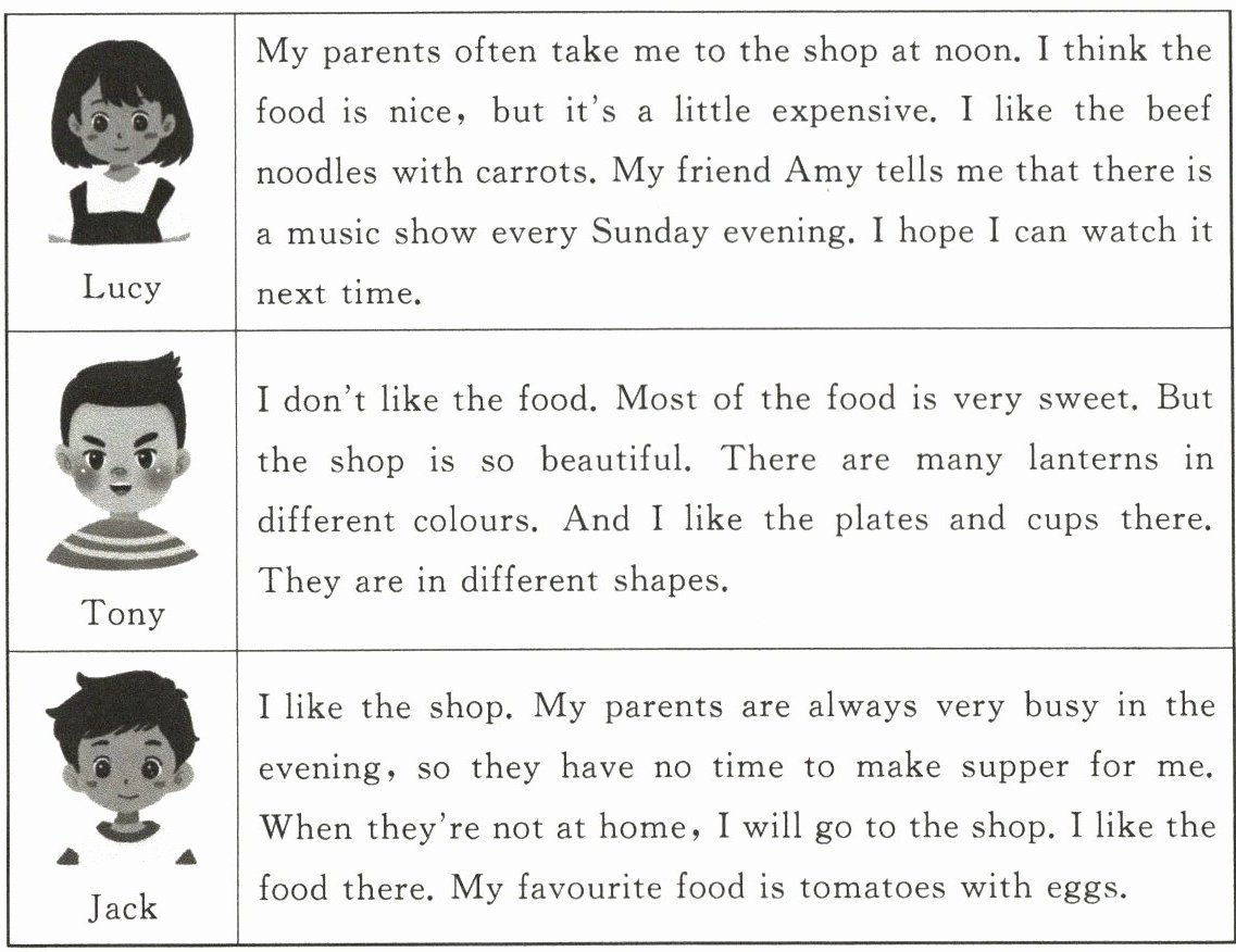 | Lucy | My parents often take me to the shop at noon. I think the food is nice, but it's a little expensive. I like the beef noodles with carrots. My friend Amy tells me that there is a music show every Sunday evening. I hope I can watch it next time. |